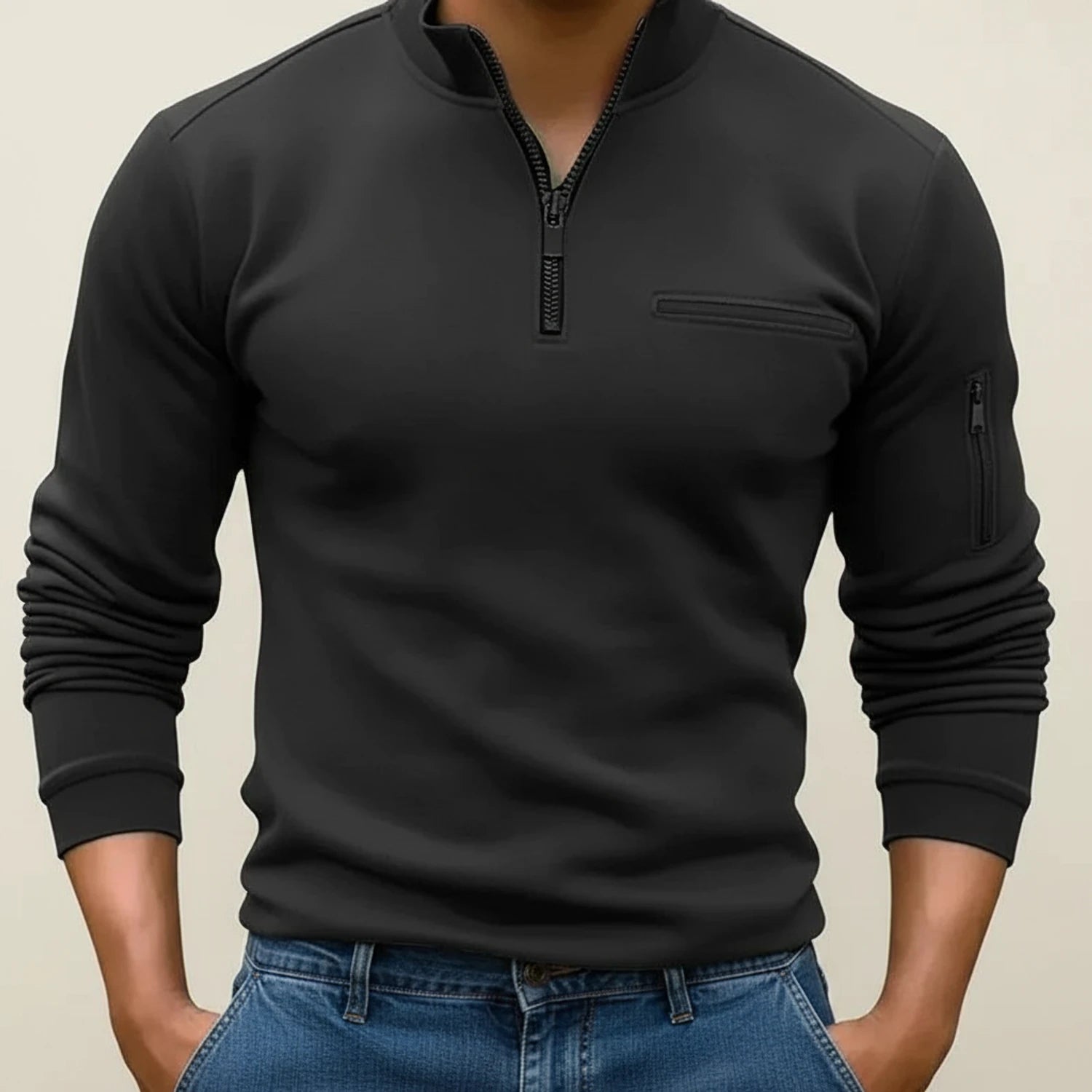 Elevate your wardrobe with this versatile men's sweater, featuring a practical quarter zip and stylish stand collar. The long sleeves offer comfortable coverage, while the chest and sleeve pocket details provide functional and fashionable accents. This piece combines classic design with modern utility, making it ideal for various occasions.