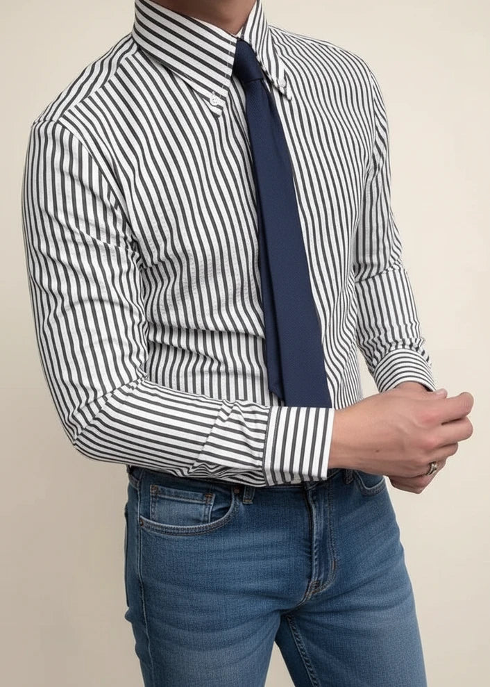 This men's striped button-up shirt offers a blend of classic style and modern appeal. The vertical stripes add a touch of sophistication, while the tailored fit provides a contemporary silhouette. Perfect for both casual and more dressed-up occasions, this long-sleeve shirt is a versatile addition to any wardrobe.