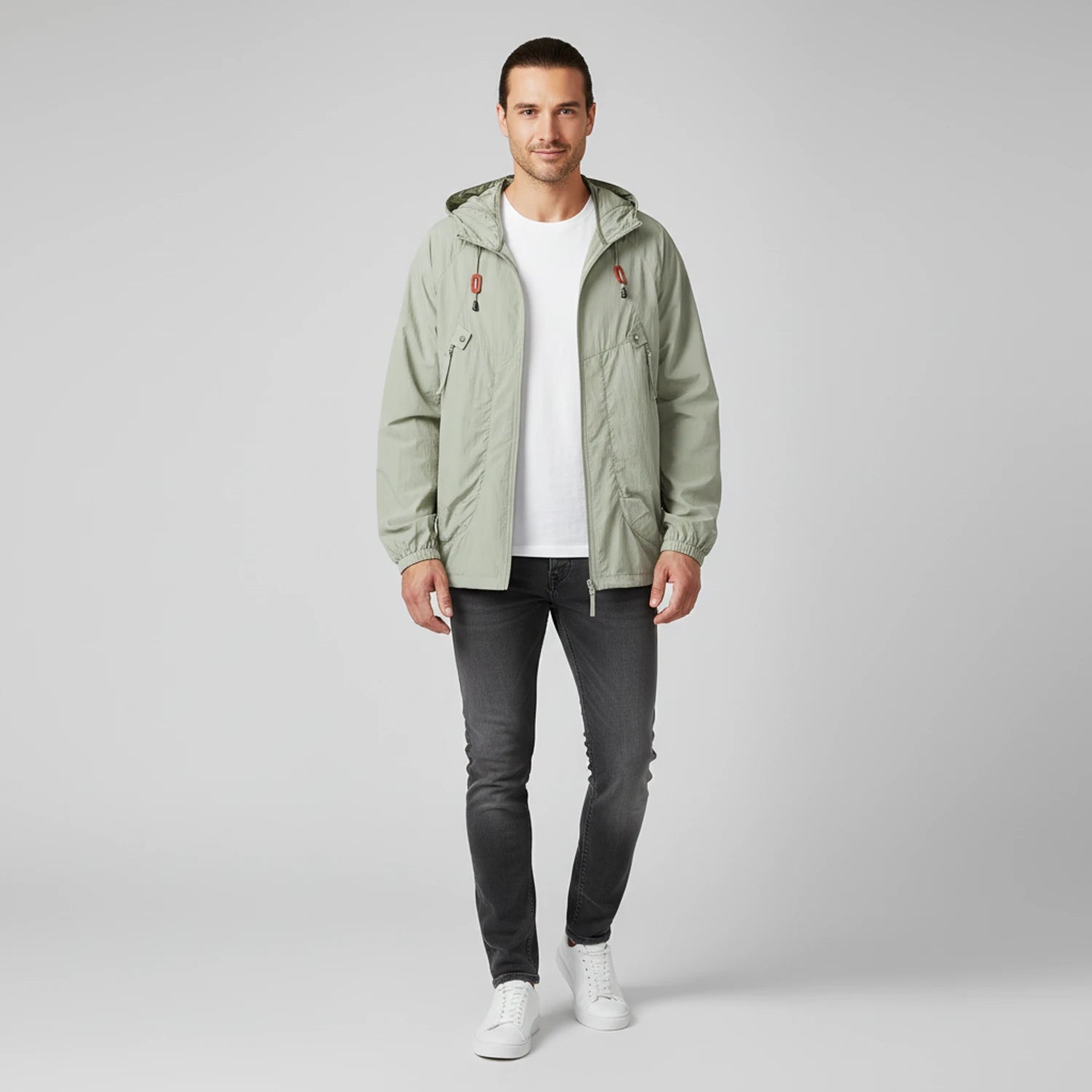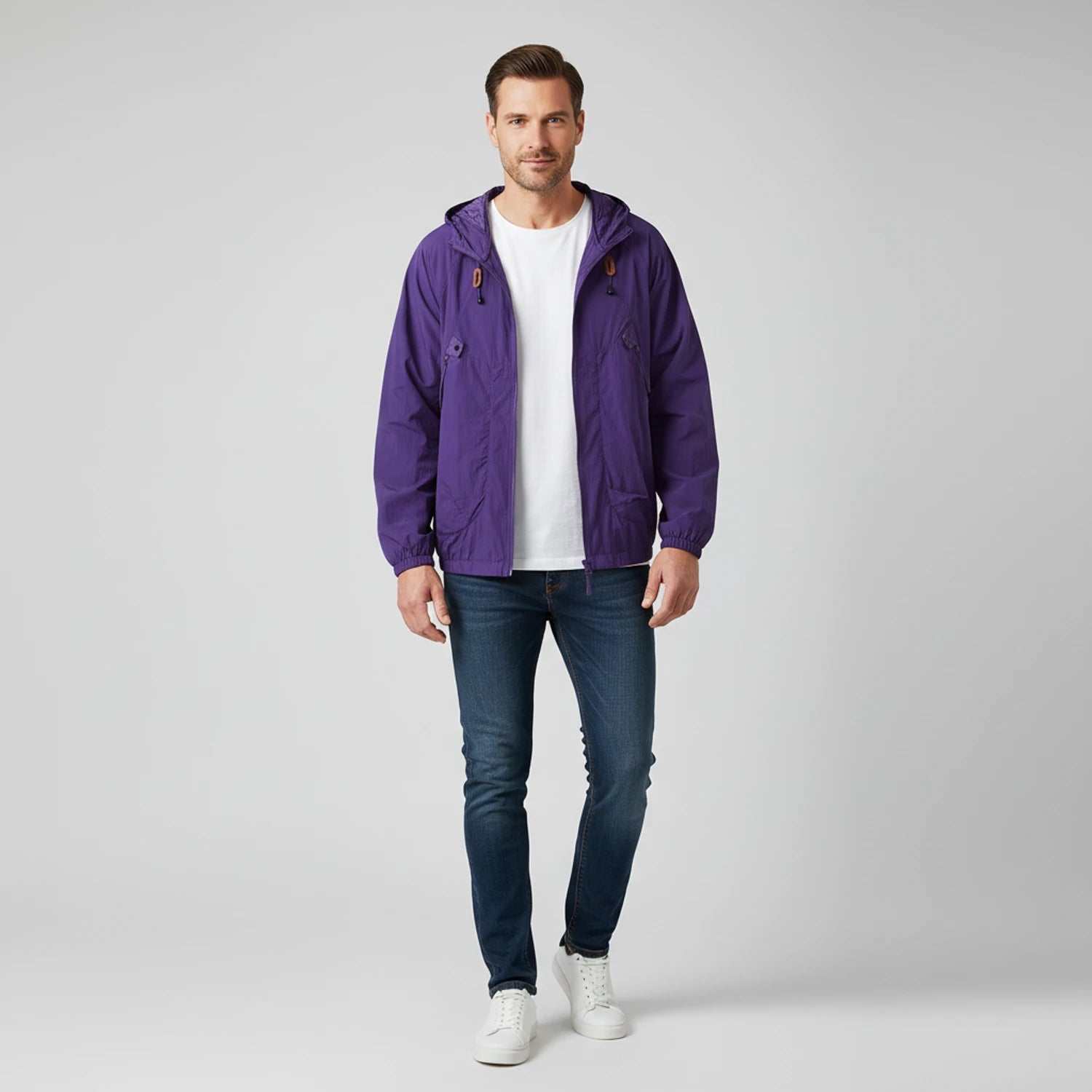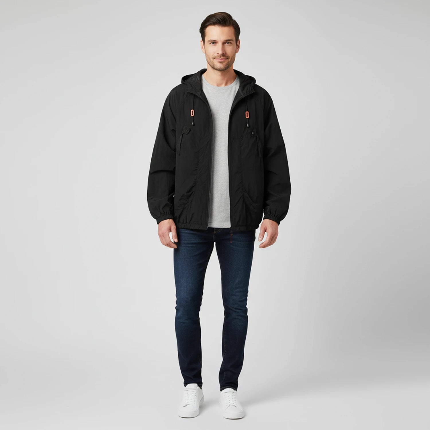 Brave the elements with this versatile men's jacket. Featuring a convenient zip-up closure, a practical drawstring hood, and comfortable elastic cuffs, this lightweight jacket is designed for everyday wear. Raglan sleeves provide enhanced mobility, making it ideal for various activities. It offers both style and protection in a sleek design.