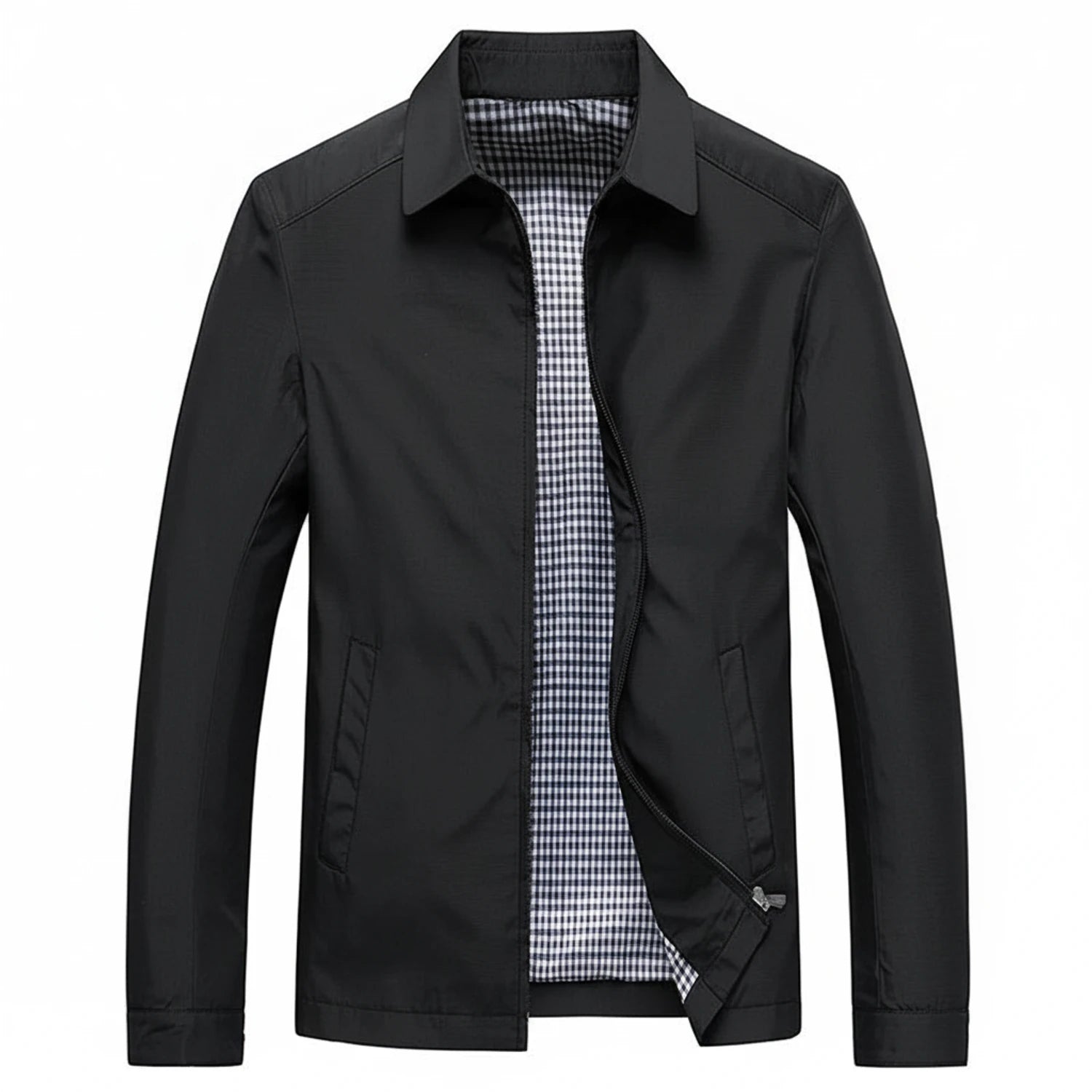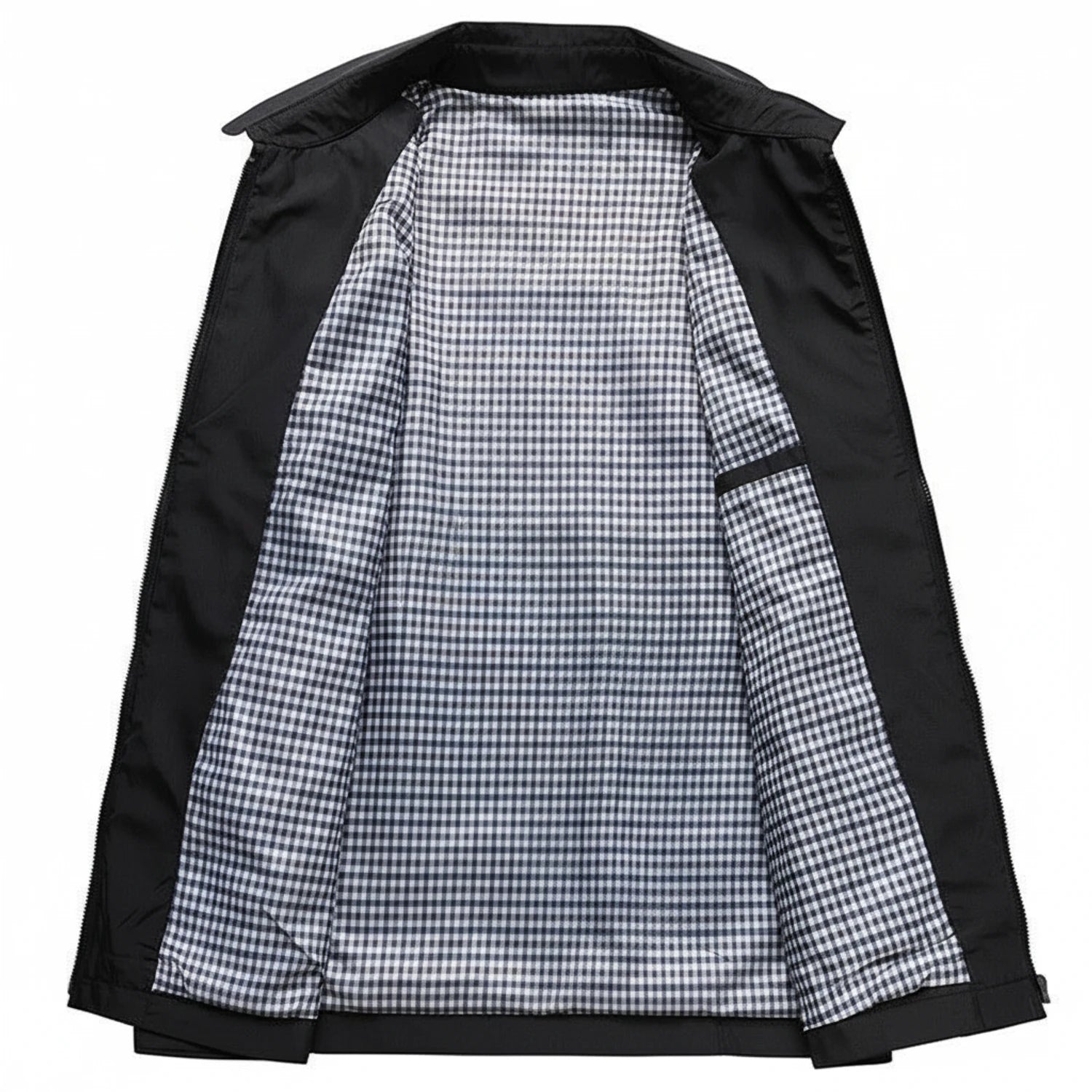 This men's zip-up jacket offers a classic casual style, perfect for everyday wear. With its collared design and lightweight construction, it provides comfort and versatility. The plaid lining adds a touch of subtle detail, enhancing its overall appeal.