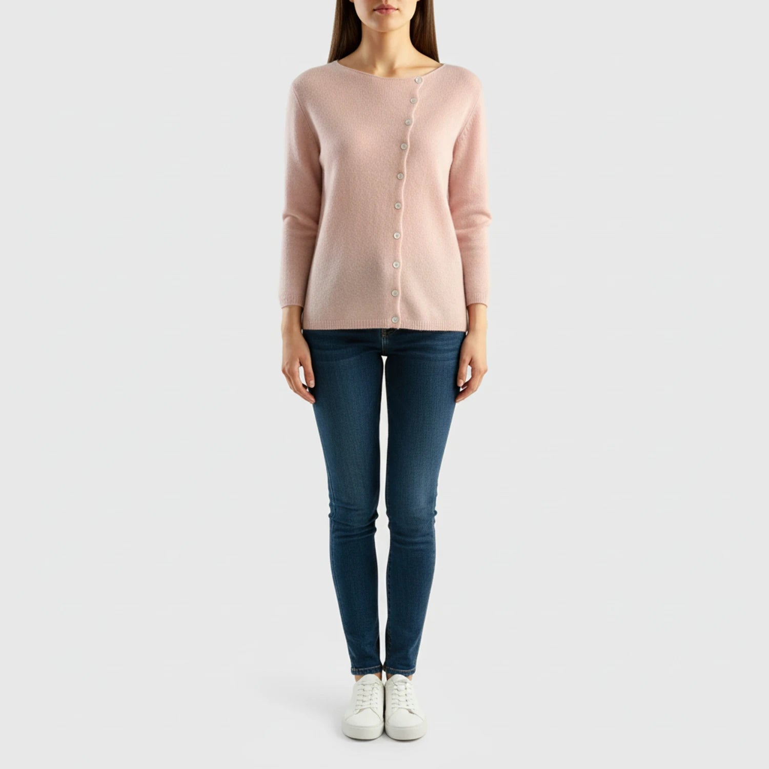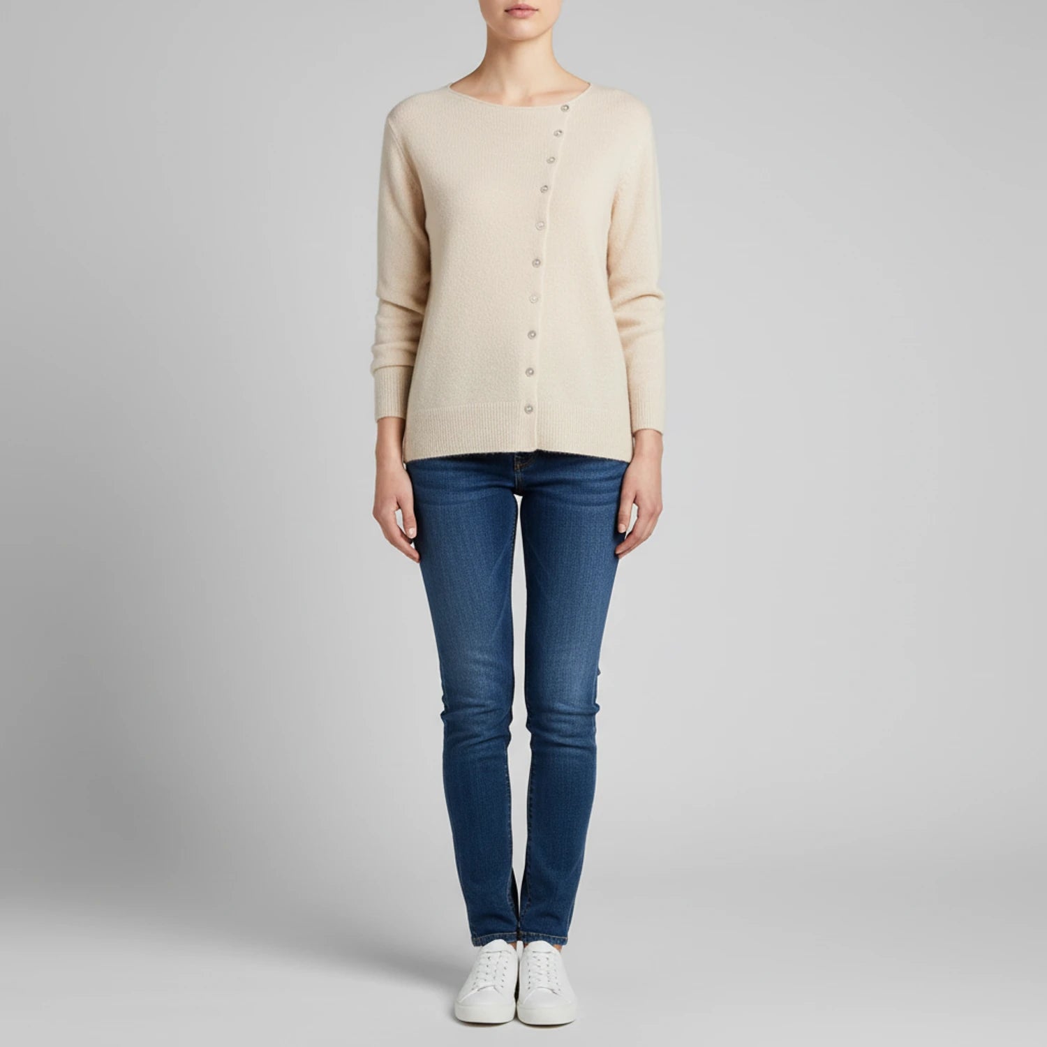 This women's button-down sweater offers a relaxed fit and versatile style, perfect for layering or wearing on its own. The asymmetrical button design adds a unique touch, while the crew neck and long sleeves provide classic comfort. Style it as a cardigan for added flair and adaptability.