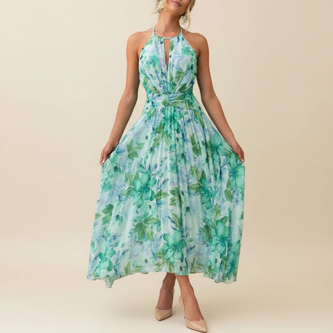 This floral A-line maxi dress features a halter neckline and sleeveless design, perfect for warm weather occasions. The flowing silhouette and vibrant floral pattern create an eye-catching look, making it ideal for both casual events and dressier occasions. Its comfortable and stylish design ensures a flattering fit for any body type, similar to the elegant styles seen in competitor maxi dresses.