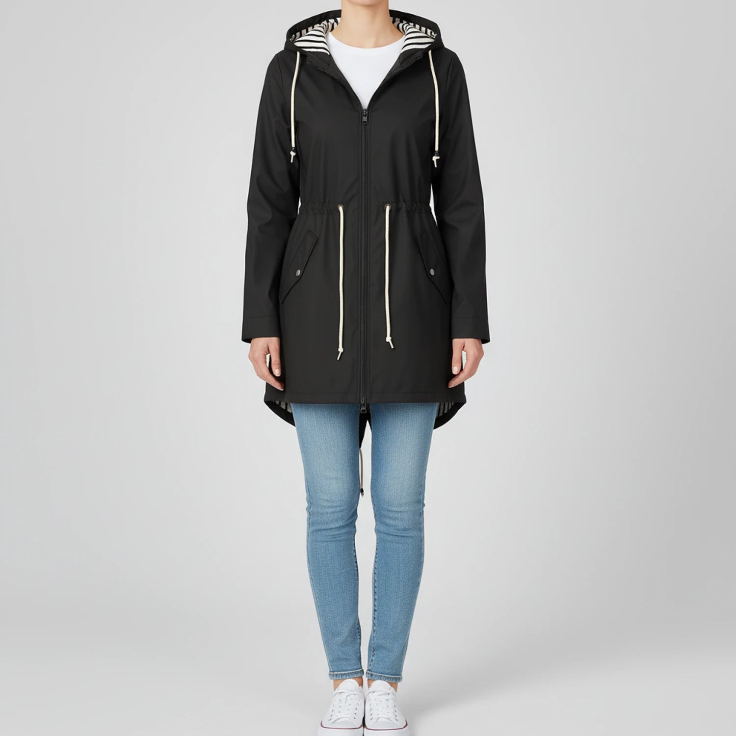 Brave the weather in style with this women's hooded anorak jacket. Featuring a modern longline silhouette and a practical full zip closure, this jacket offers both fashion and function. The adjustable drawstring waist ensures a flattering fit, while the hood provides extra protection from wind and rain, as seen in our product imagery and competitor descriptions.