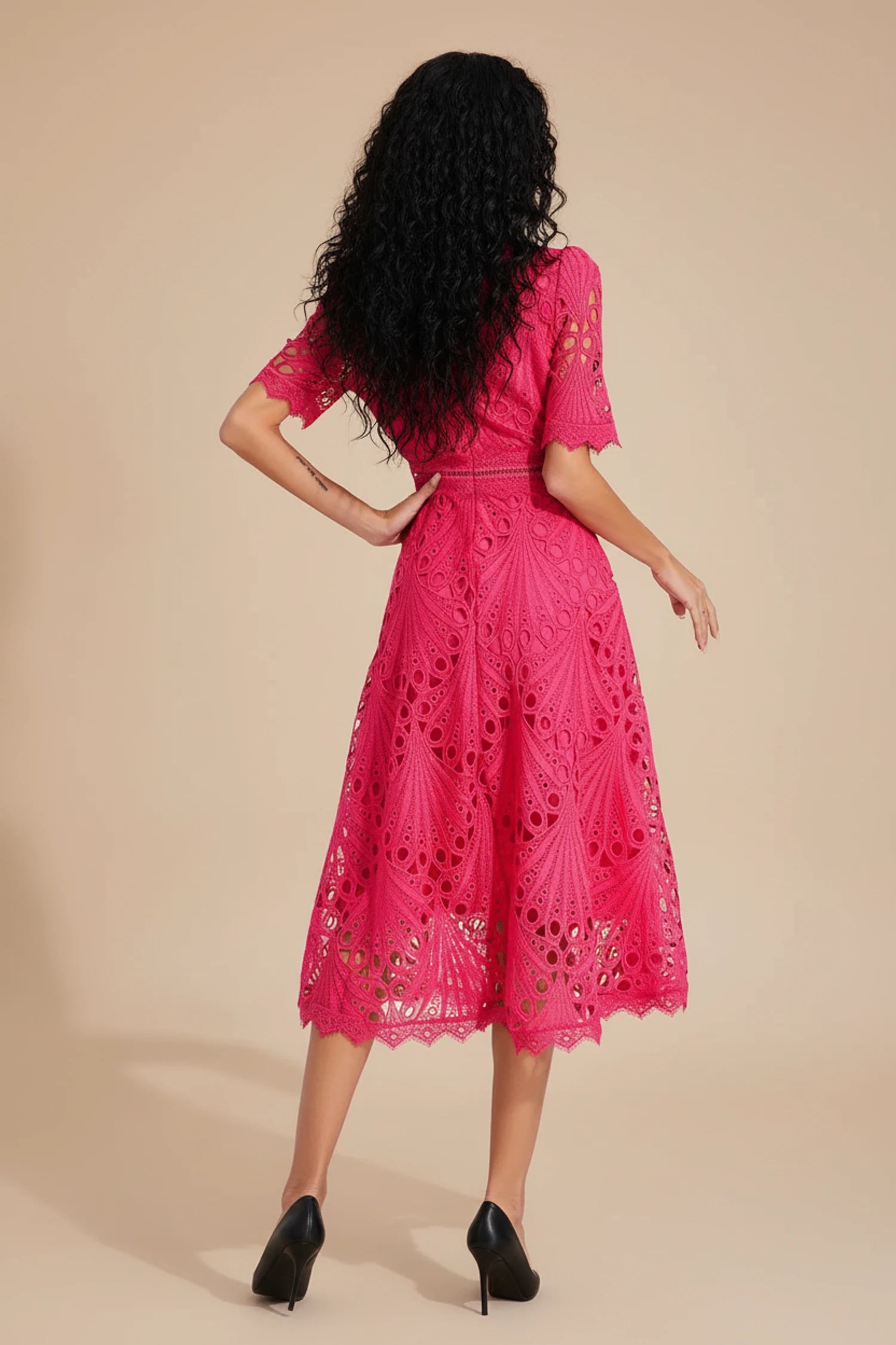 This A-line midi dress features delicate lace detailing and a flattering silhouette. The high neckline and short sleeves add a touch of sophistication, making it perfect for cocktail parties, date nights, or wedding celebrations. Its fit and flare design enhances the feminine charm, creating an elegant look for any special occasion.