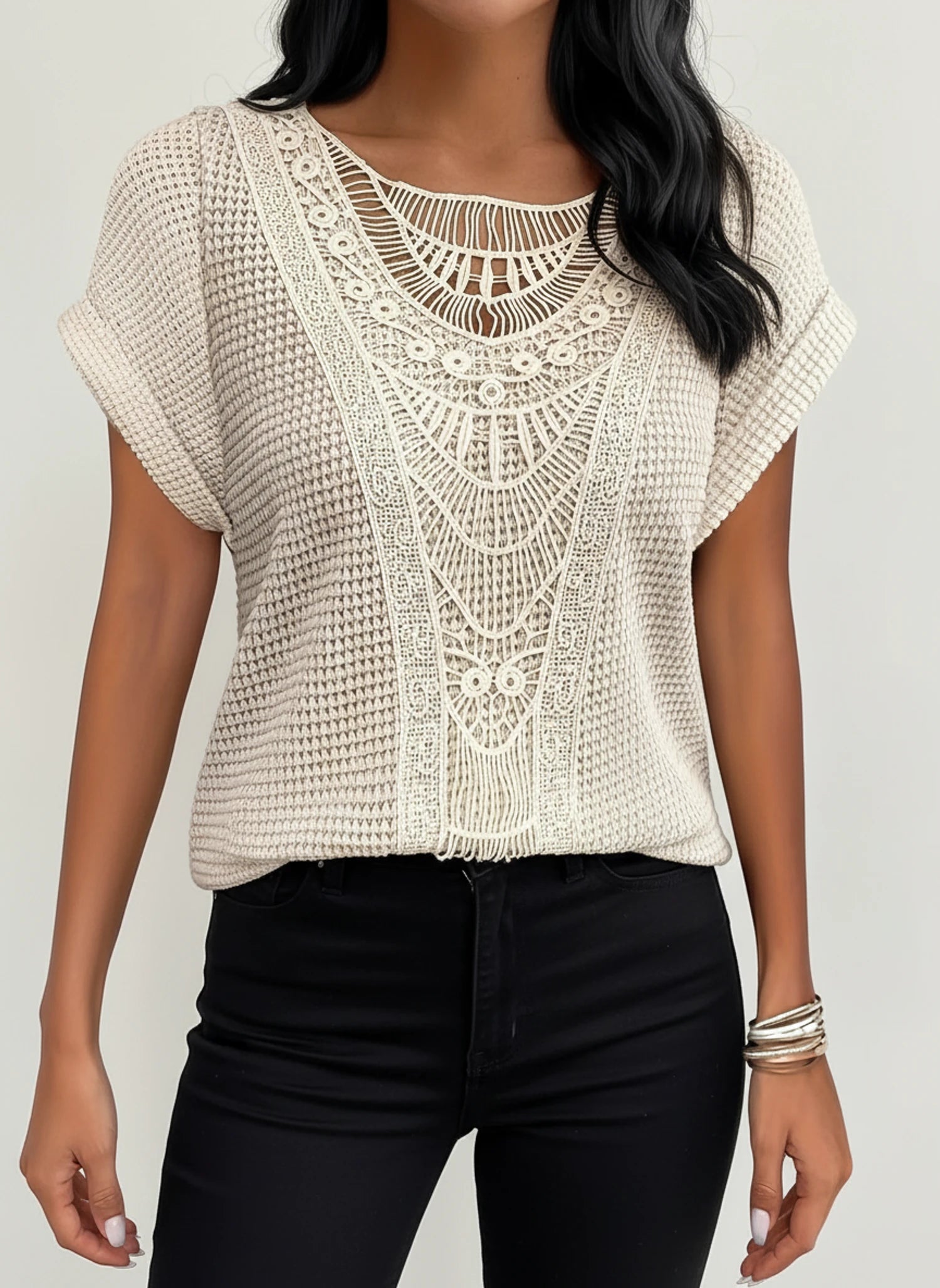 This women's lace blouse features a relaxed fit and short sleeves, perfect for a boho-chic look. The yoke detail adds a touch of sophistication, while the textured knit provides a unique visual appeal. A versatile addition to any wardrobe, easily dressed up or down.