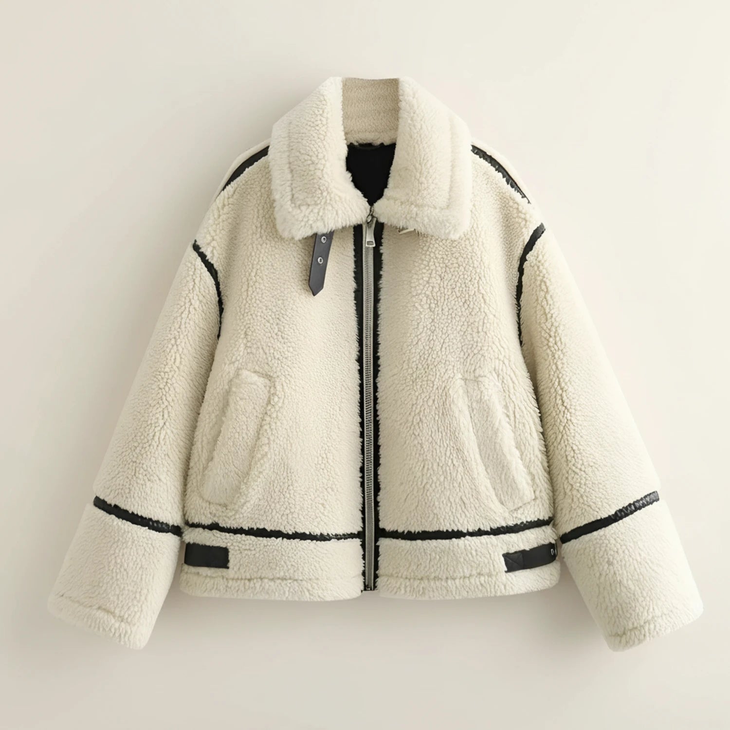 This women's sherpa aviator jacket combines classic style with cozy comfort. Featuring a distinctive sherpa texture and faux leather trim, this zip-up jacket offers a relaxed fit that's perfect for everyday wear. The design draws inspiration from traditional aviator jackets, updated with modern details for a versatile and stylish look.