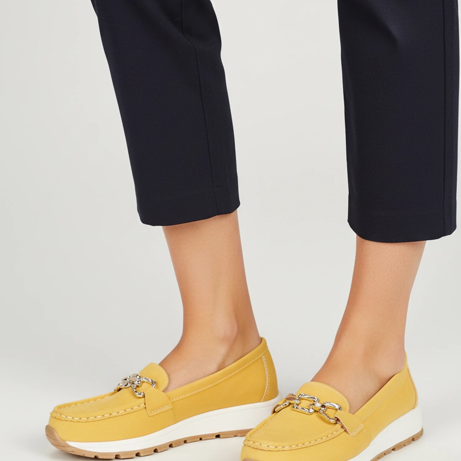These women's slip-on loafers offer a perfect blend of style and convenience. Featuring a sleek design with a distinctive gold buckle detail and a subtle platform sole, these shoes effortlessly elevate any casual outfit. Inspired by classic driving shoe aesthetics, they provide both comfort and a touch of sophistication for everyday wear.