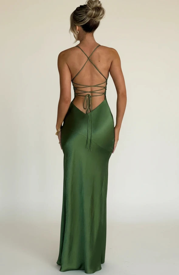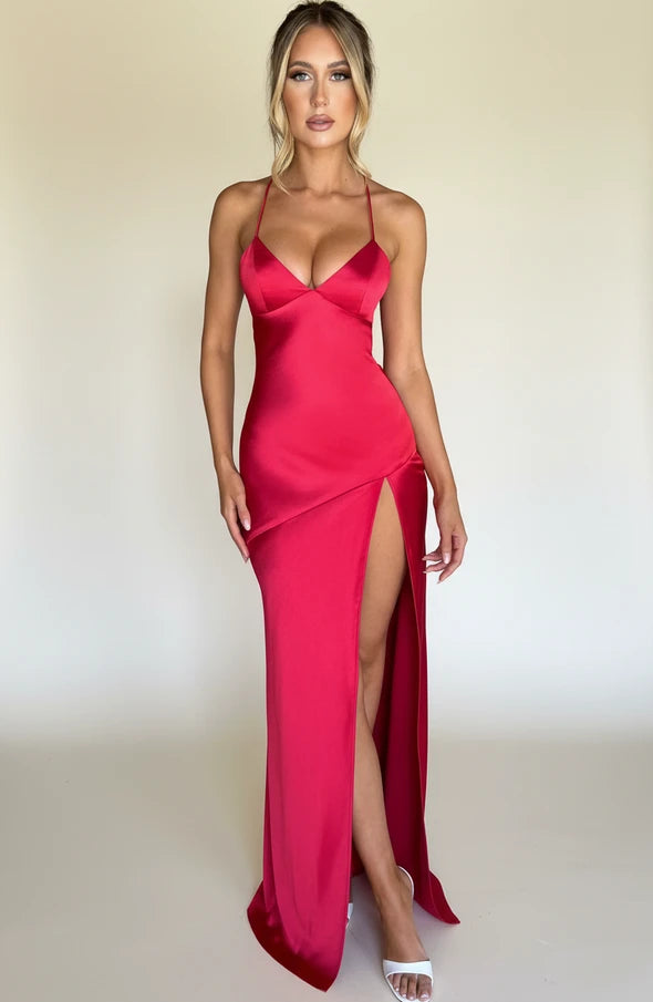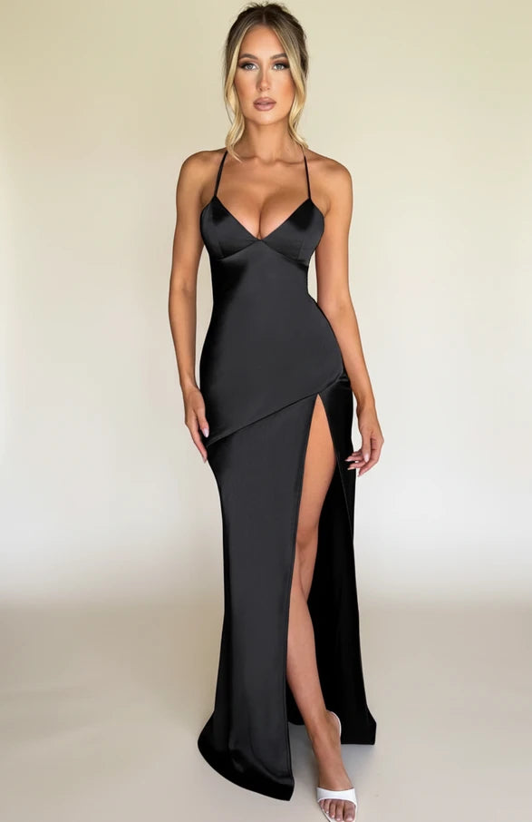 The Thigh-Slit Slip Maxi Dress offers a sophisticated allure with its sleek silhouette and daring slit. Designed for statement-making elegance, it features delicate spaghetti straps and a criss-cross tie back. Perfect for elevating your evening wardrobe with modern charm.