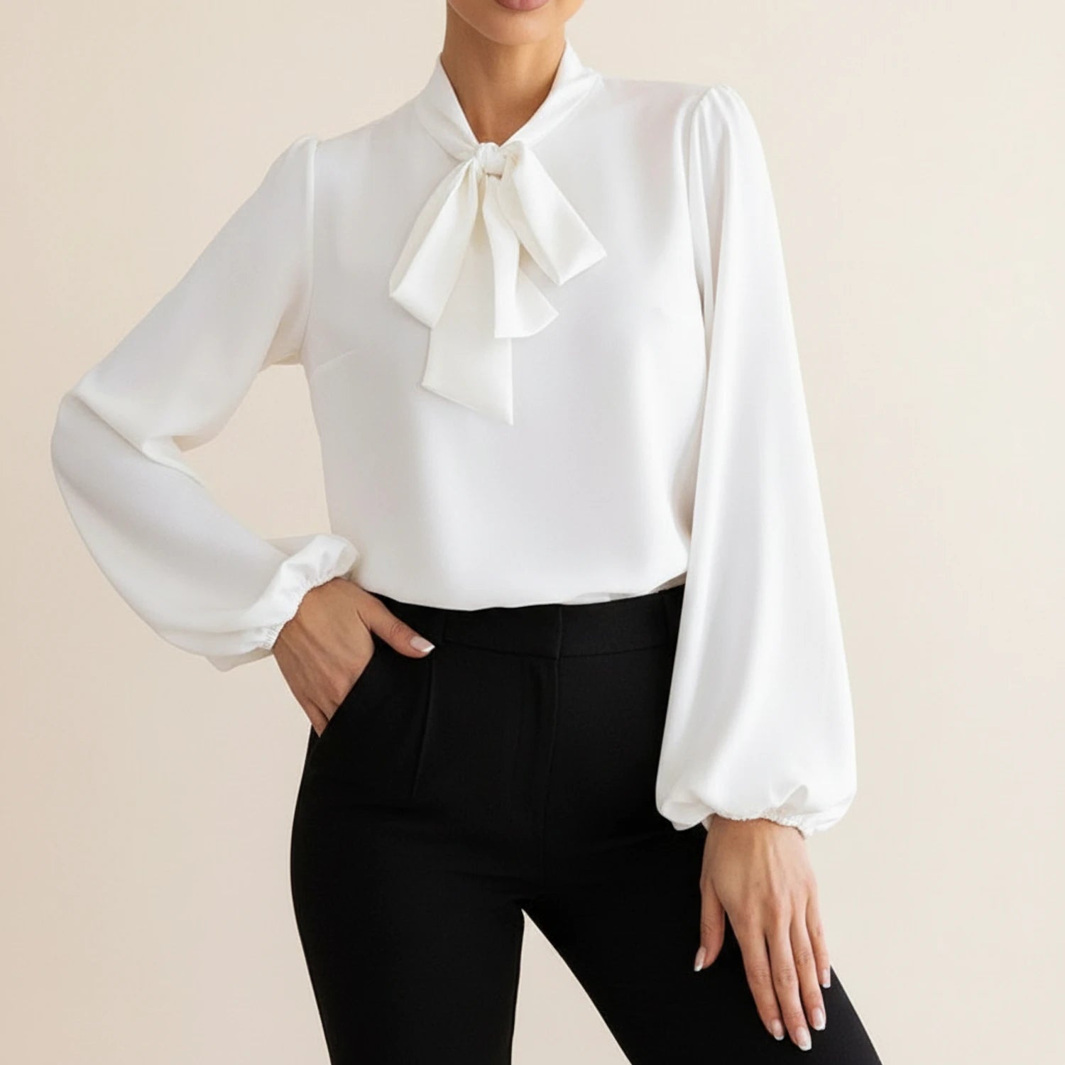 This women's tie neck blouse offers a sophisticated and versatile addition to any wardrobe. The long sleeves and relaxed fit ensure comfort, while the tie neck detail elevates the style, making it suitable for both professional and dressy occasions. The balloon sleeves and buttoned cuffs add a touch of modern flair, distinguishing it from standard blouse designs.