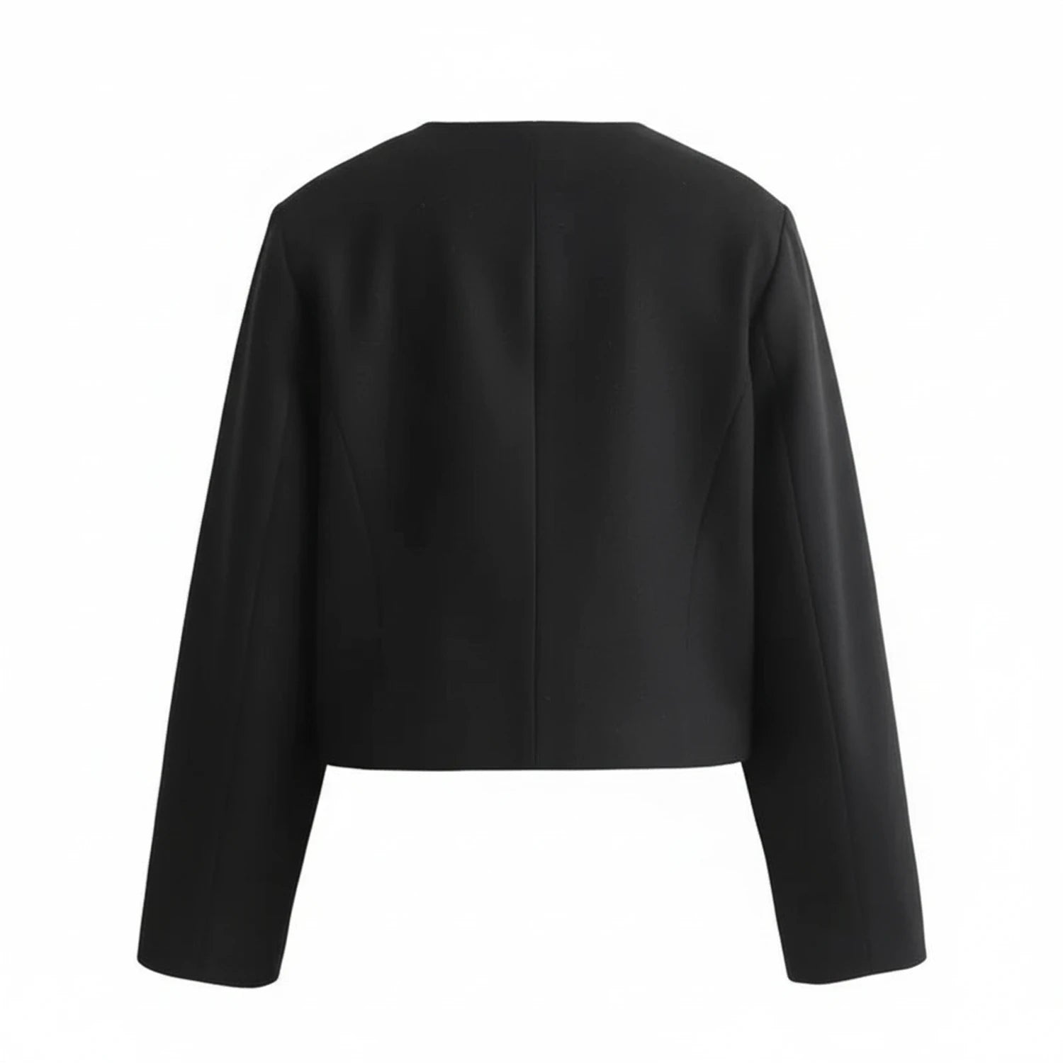 This women's collarless jacket presents a modern and sleek silhouette, perfect for versatile styling options. Its cropped design offers a contemporary edge, making it suitable for both casual and semi-formal occasions. Featuring a button-front closure and patch pockets, this jacket combines functionality with minimalist aesthetics.