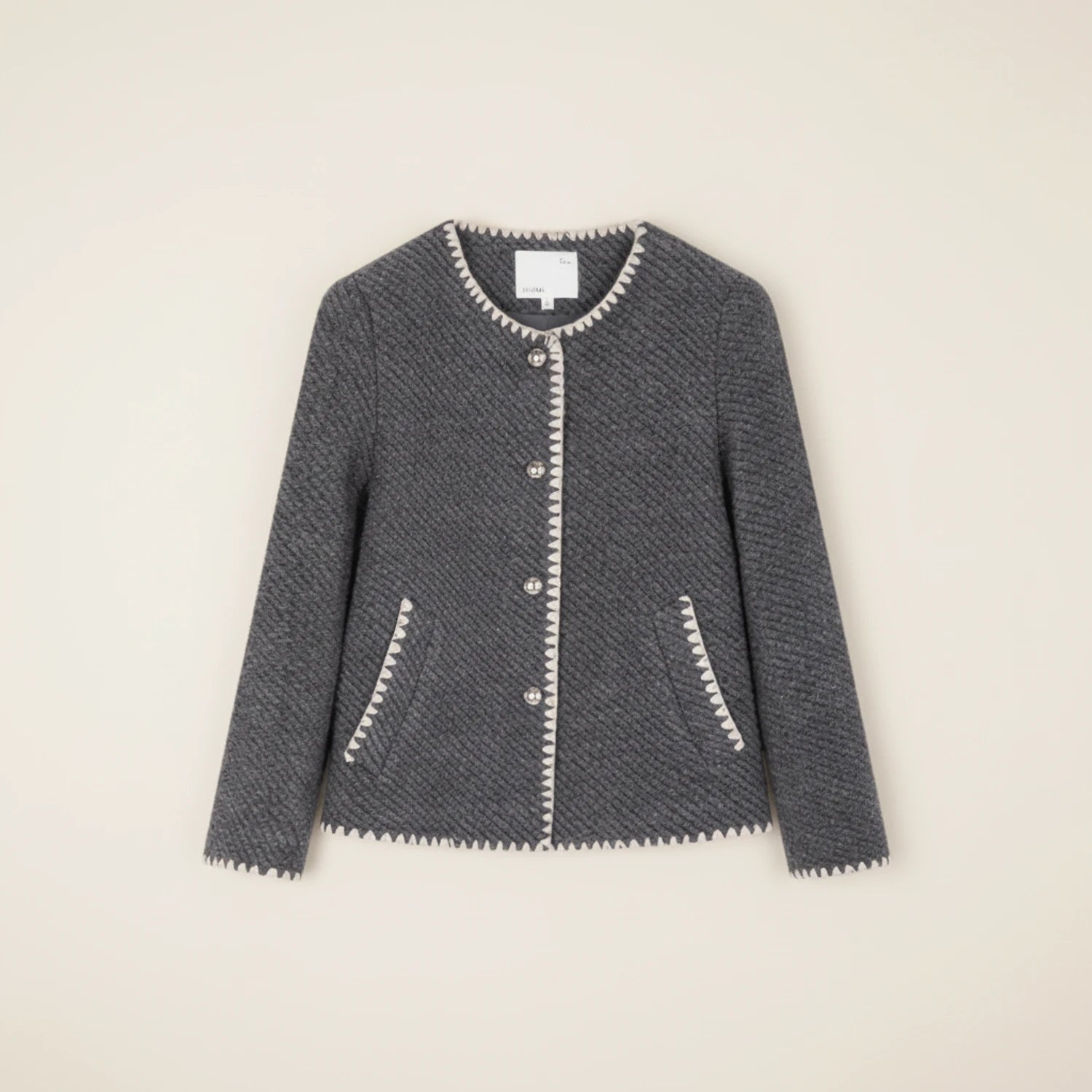 This Women's Collarless Coat offers a modern and streamlined silhouette. Featuring a button-front closure and relaxed fit, this gray cropped coat provides both comfort and style. With its unique edge trim detailing, it's a versatile addition to any wardrobe, perfect for layering or wearing on its own.
