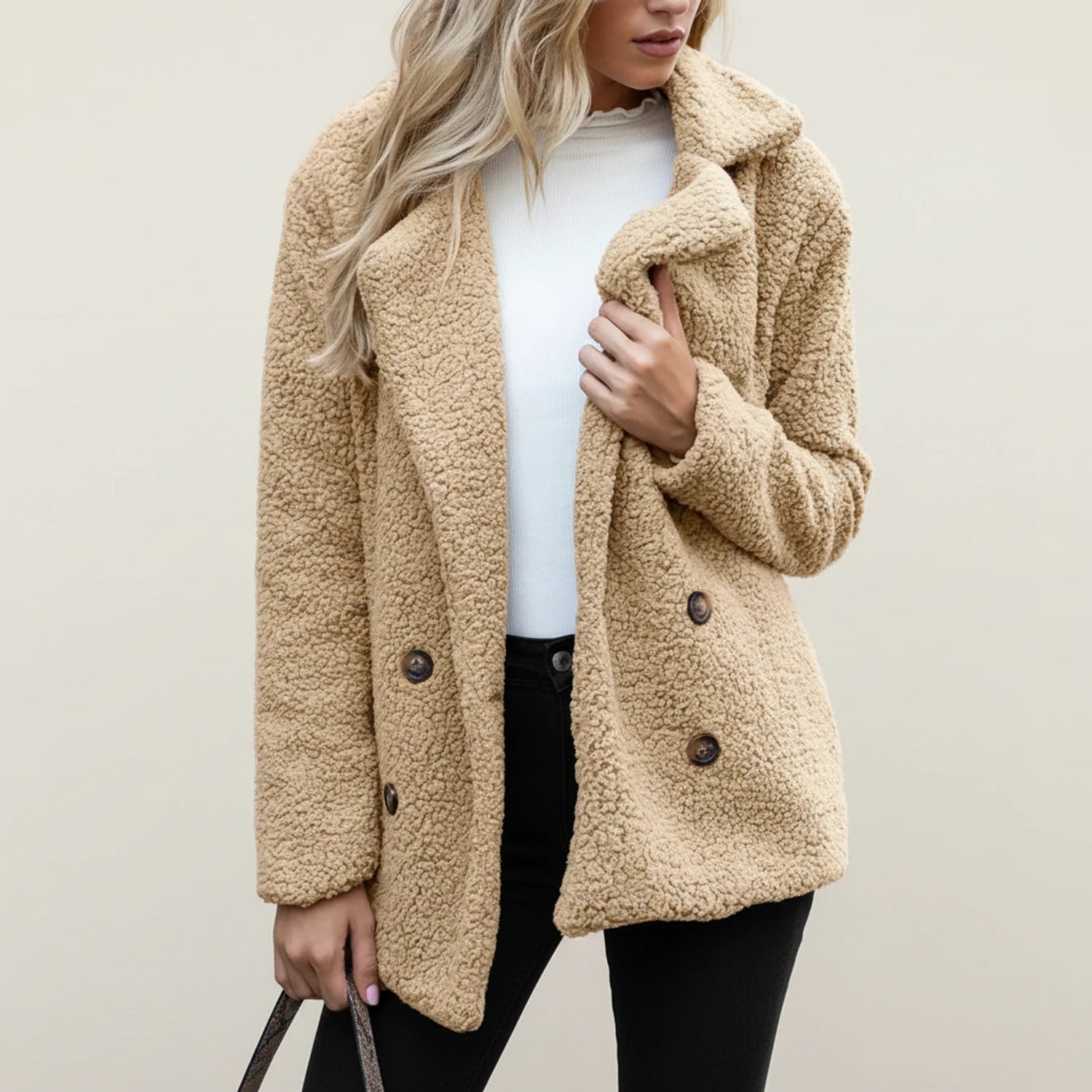 This women's double-breasted jacket offers a classic silhouette with a modern, relaxed fit. The teddy jacket texture adds a touch of cozy comfort, making it perfect for cooler weather. Its collared design and long sleeves enhance its versatile style, suitable for various occasions. This jacket is an ideal blend of sophistication and comfort.