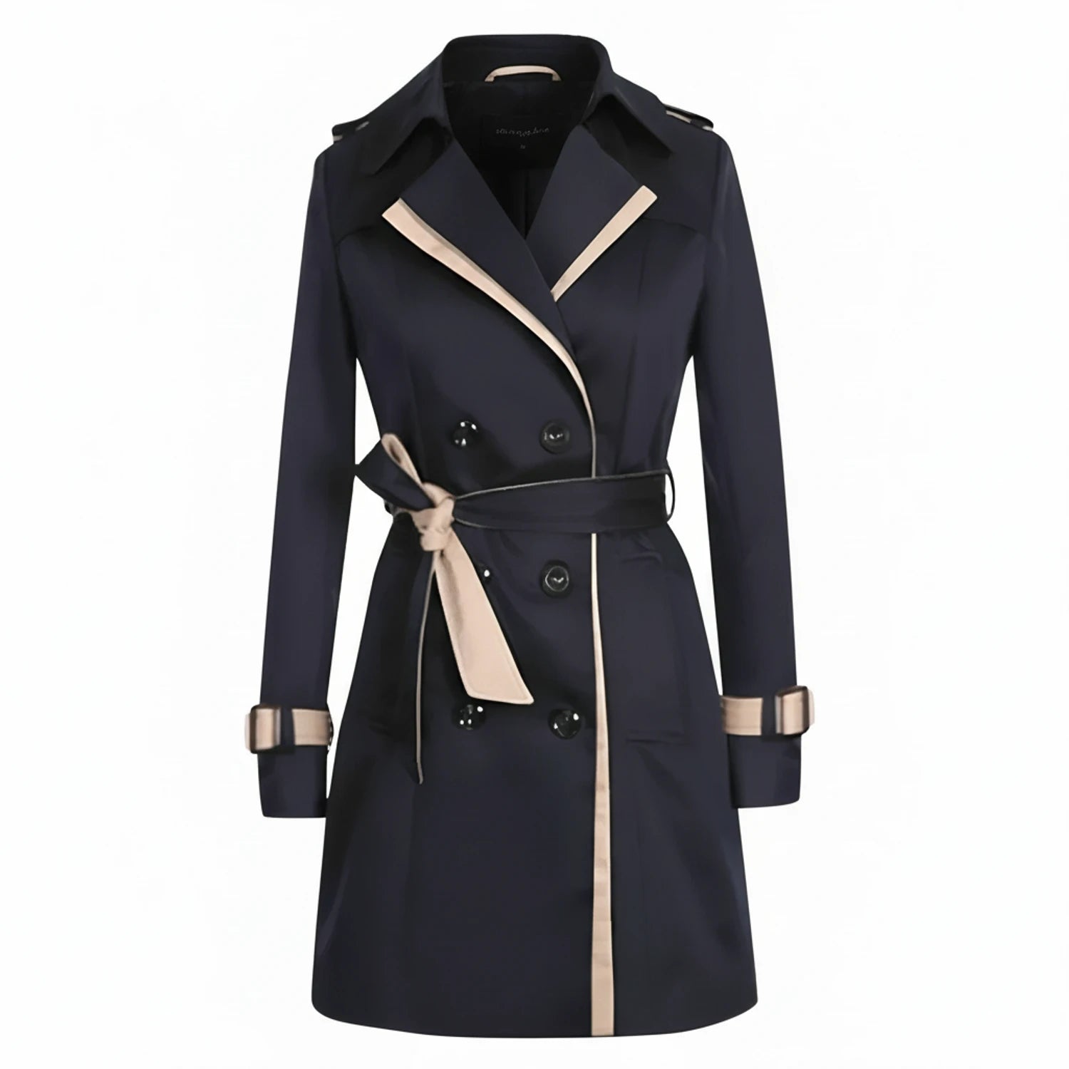 This double-breasted trench coat offers a timeless silhouette with a modern twist. Featuring a mid-length cut and distinctive notched lapel, this coat is designed to elevate any outfit. The belted sleeves and contrasting trim add unique details to this classic style, perfect for completing your sophisticated look.