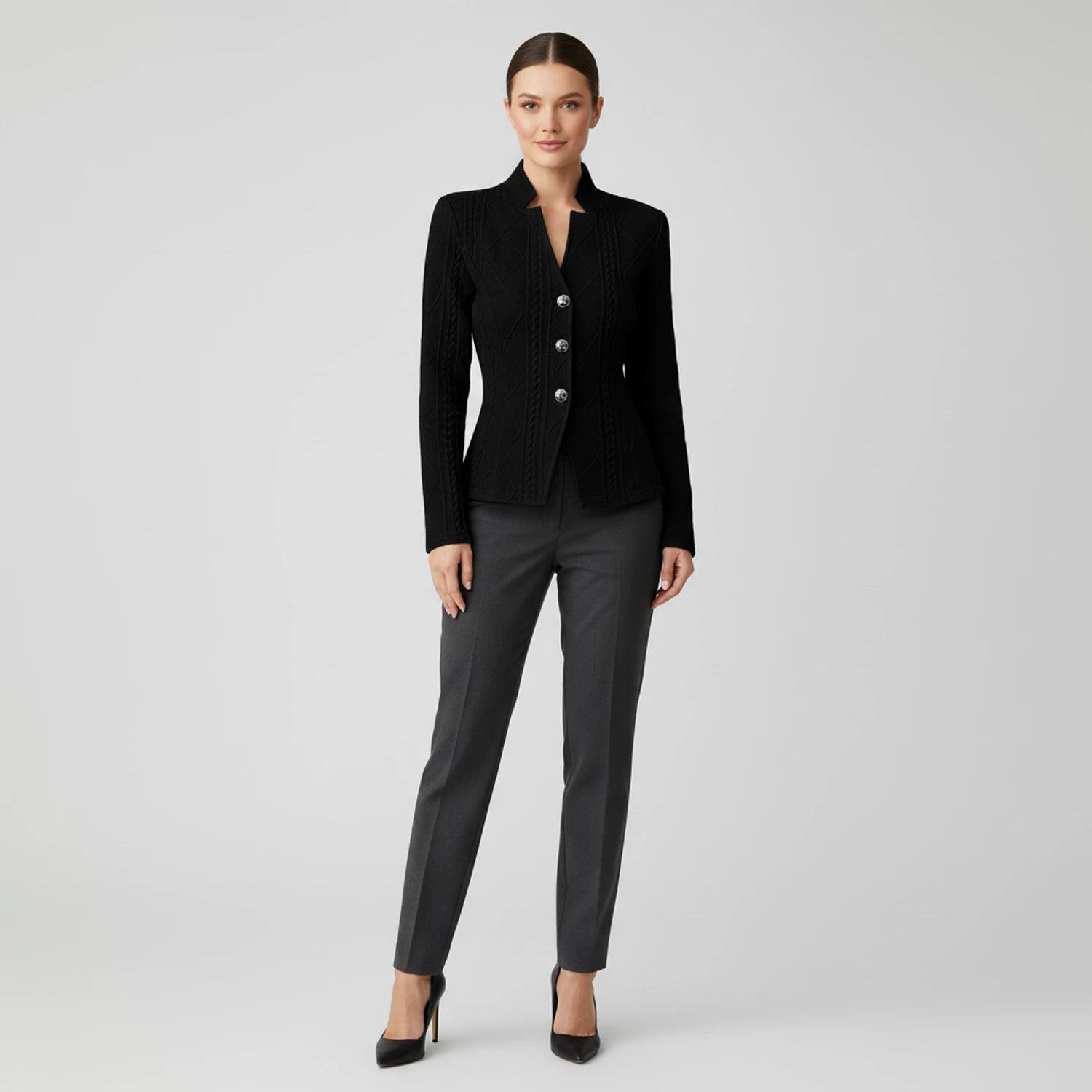 This button-front jacket offers a sleek, fitted silhouette that's perfect for adding a touch of polish to any outfit. The stand collar and textured fabric create a unique and sophisticated look. Inspired by classic blazer designs, this jacket provides a modern and versatile alternative for both casual and professional settings.
