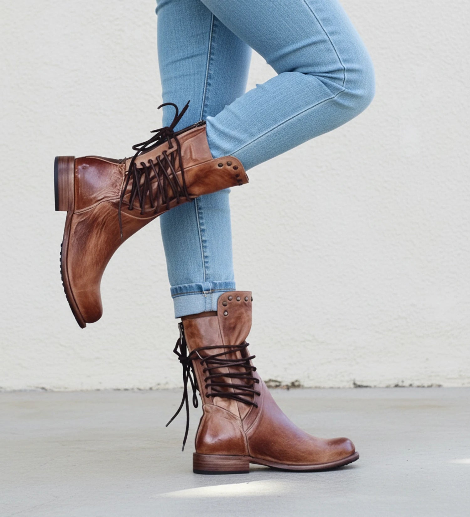 These women's lace-up mid-calf boots offer a blend of classic style and modern edge. Featuring a secure lace-up design and a distinctive distressed leather look, they provide both fashion and functionality. The added zipper accent and subtle stud detailing make them a versatile choice for various outfits, from casual to more dressed-up looks.