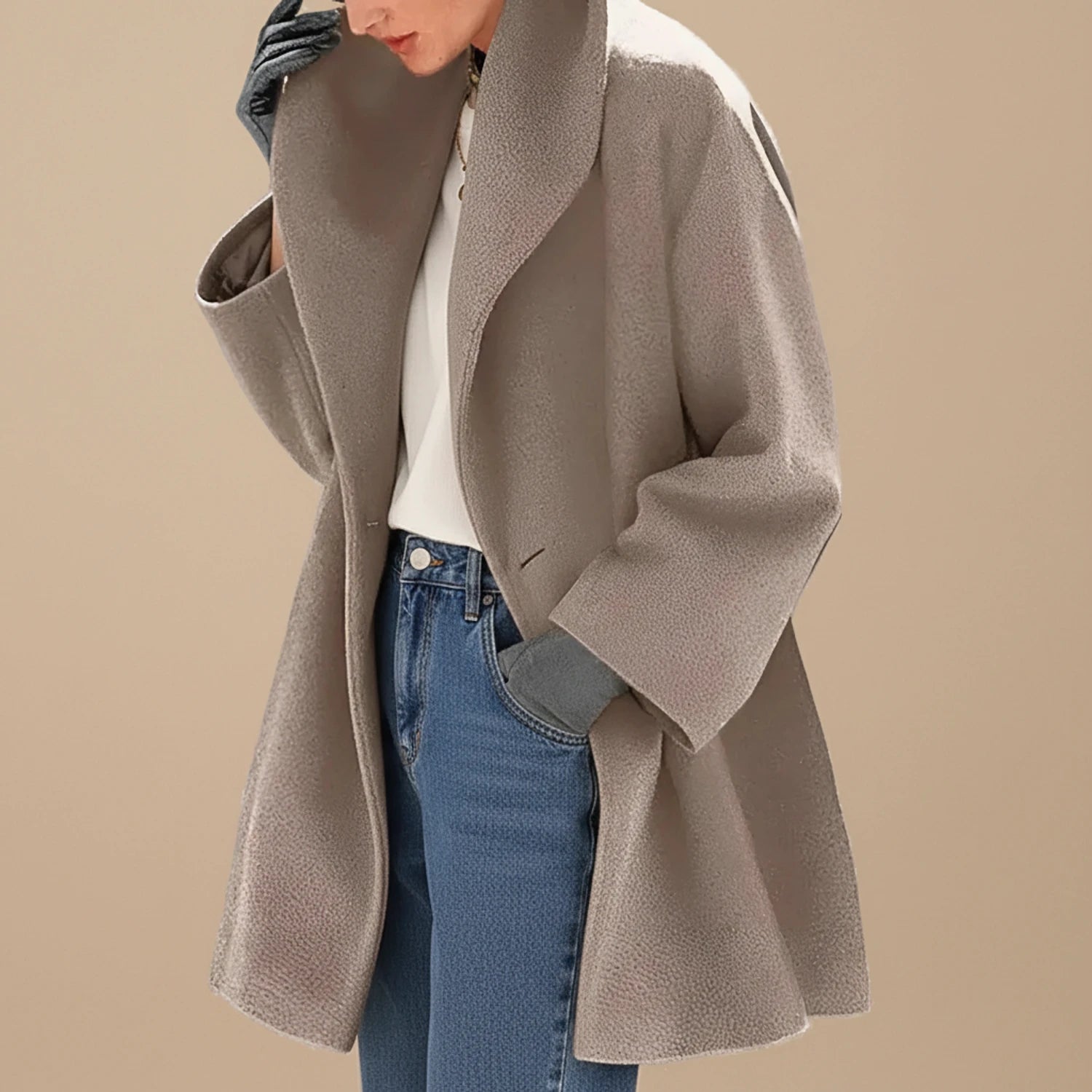 This swing coat offers a relaxed silhouette with its distinct A-line shape and wide collar, perfect for a modern, comfortable style. The mid-length cut adds versatility to this oversized jacket, making it ideal for various occasions. Inspired by current trends and designed for ease of wear, this jacket provides both fashion and function.