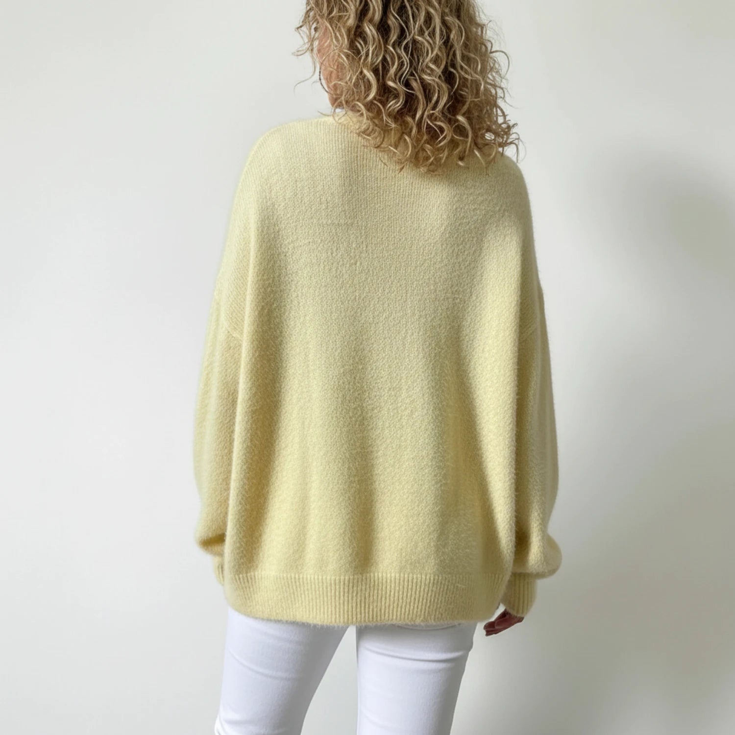 This women's cardigan sweater offers a relaxed and comfortable fit. The oversized design and button-front closure create a versatile piece that can be styled in numerous ways. Its V-neck and long sleeves make it ideal for layering during cooler seasons, offering both style and practicality.
