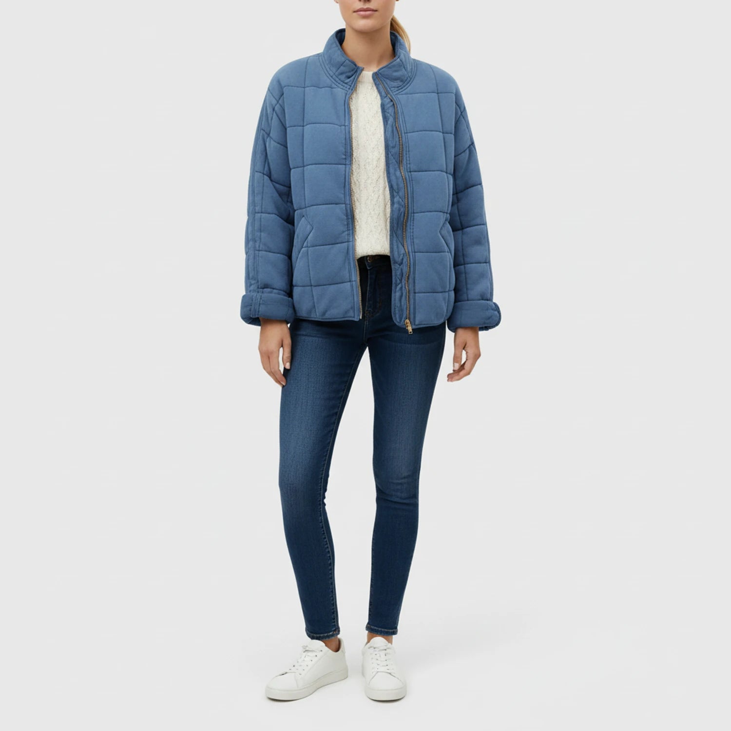 This women's quilted bomber jacket combines the classic bomber silhouette with a modern stand collar, offering a versatile outerwear piece for any wardrobe. The loose fit ensures comfortable layering, while the front zipper provides easy wear. A stylish and practical choice for transitional weather.