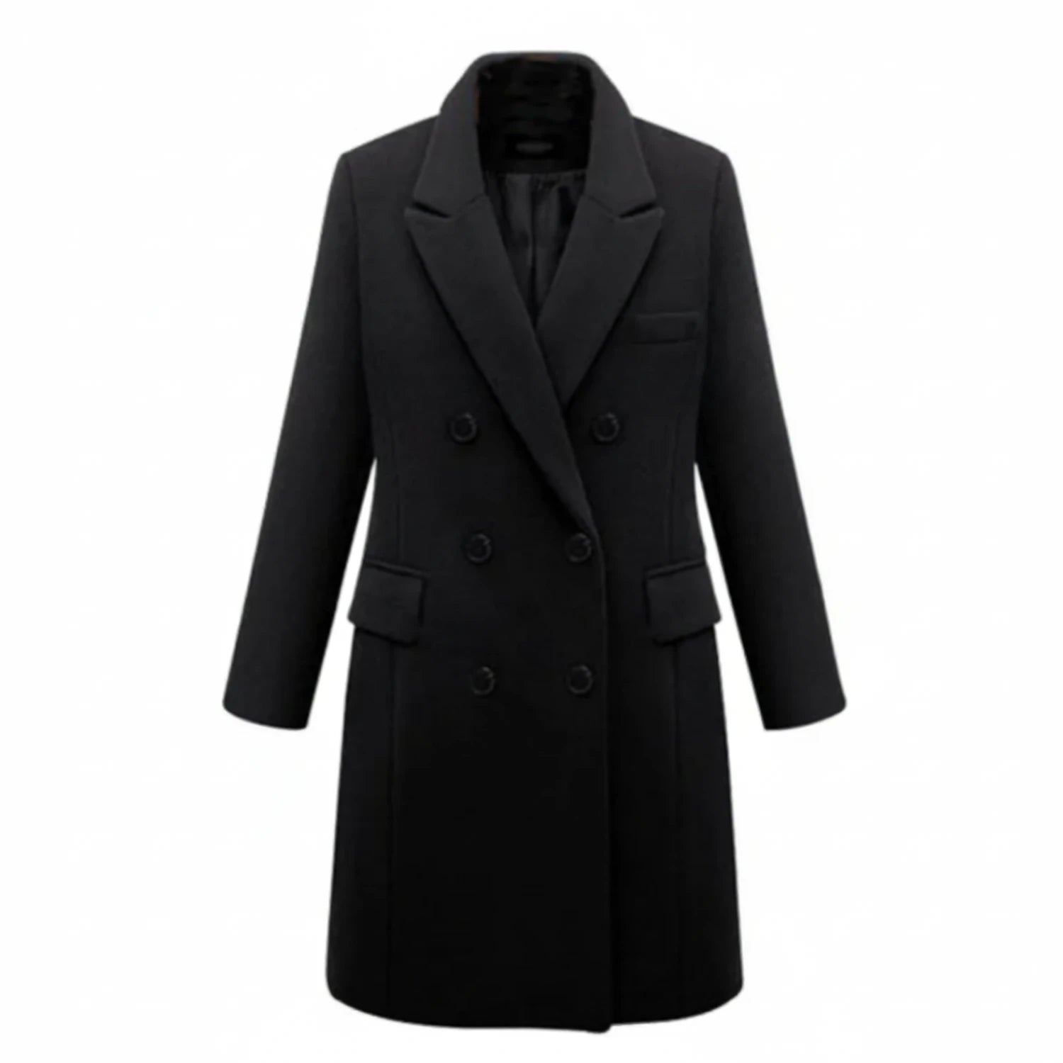 This women's double-breasted coat offers a timeless look with its below-the-knee length and tailored fit. The classic notch lapel and flap pockets enhance its refined silhouette, making it suitable for both professional and casual settings. This long coat provides both warmth and style.