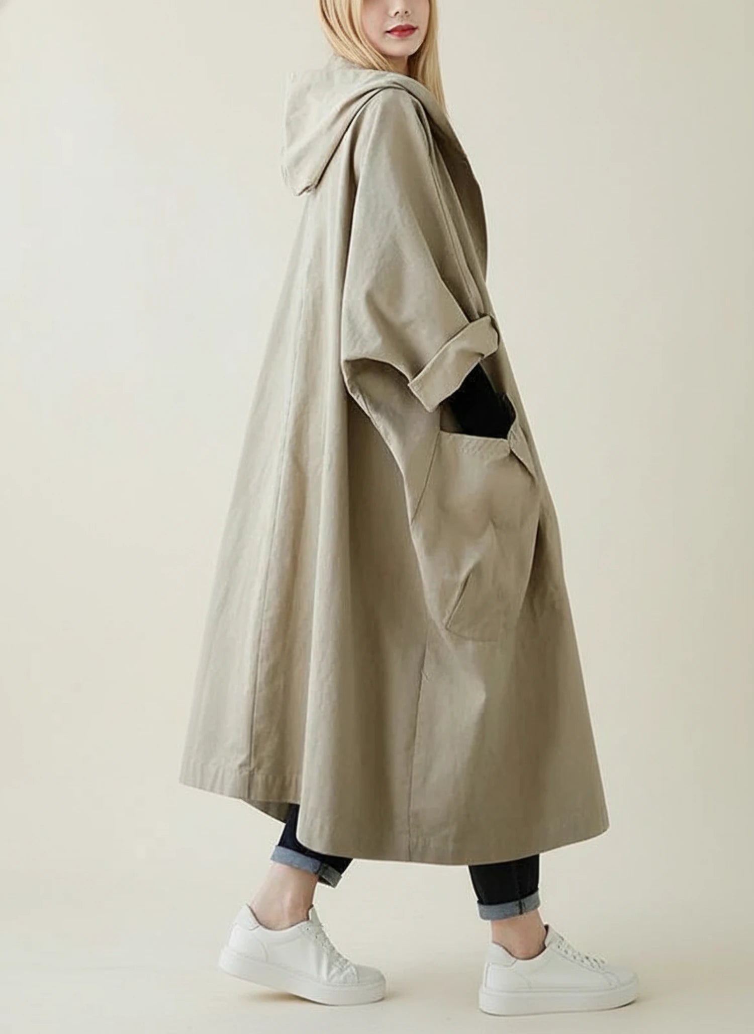 This women's oversized coat offers a relaxed and fashionable silhouette, perfect for layering. The long length provides added coverage, while the hooded design adds a practical and stylish touch. With its a-line cut and drop shoulder, this coat combines comfort and modern aesthetics, making it a versatile addition to any wardrobe.
