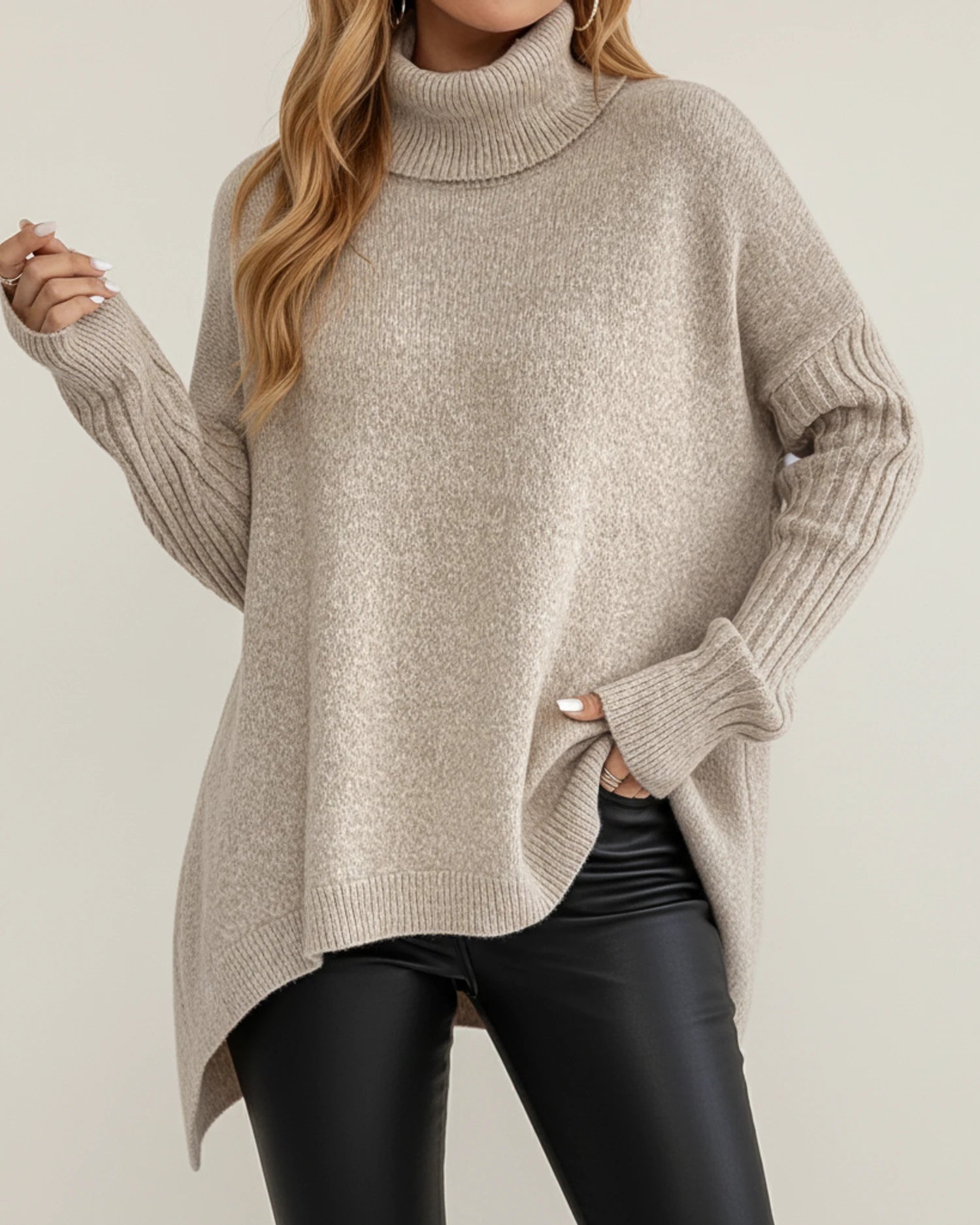 This women's oversized sweater features a stylish and comfortable design. With its distinctive asymmetric hem and cozy turtleneck, this ribbed knit sweater is a unique addition to any wardrobe. Perfect for layering or wearing on its own, it offers both style and warmth.